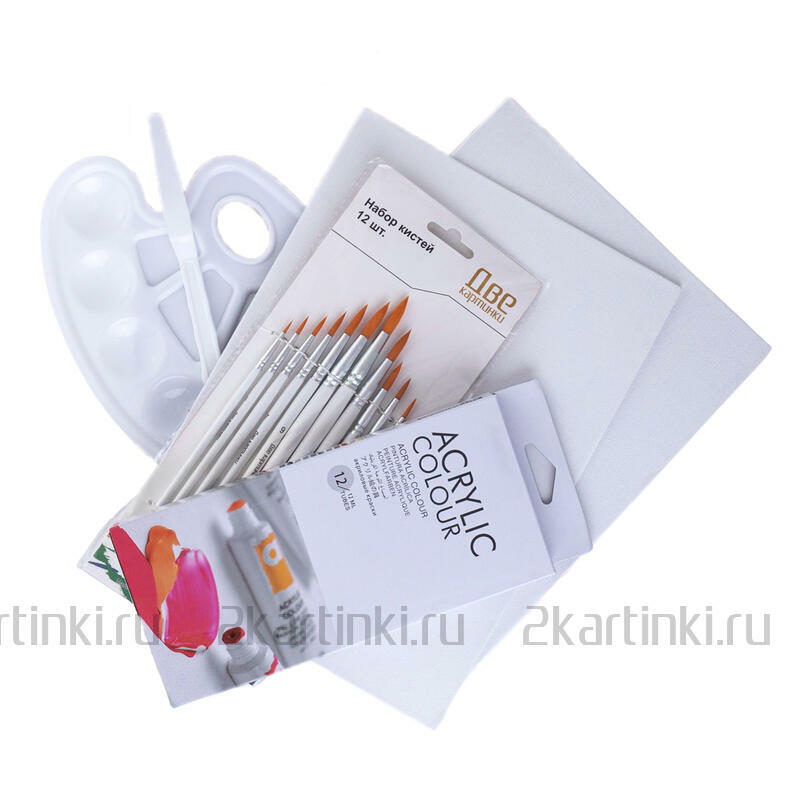 Холсты 2 шт., акриловые краски 12 шт., кисти 10 шт., палитра, мастихин 1 шт.